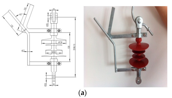 The structures of the ground wire insulator and parallel gap are shown in Figure 2. In Figure 2a,b are shown the pendant and tension structure charts of the ground wire insulator and parallel discharge gap, respectively. The technical parameters of the ground wire insulator are shown in Table 1. The parallel gap is composed of two electric poles which are installed on fittings; one pole is fixed on the tower and the other is connected with the pre-twisted suspension clamp of OPGW. The distance of the electric poles can be adjusted by voltage level, and the guide arc poles which are installed on the OPGW are made of heat-resistant steel.