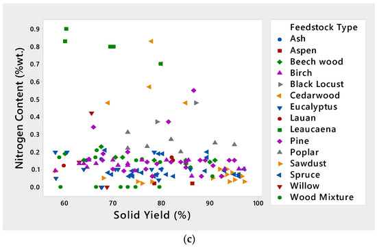 Variation of (a) Carbon (% wt.) (b) Hydrogen (% wt.) and (c) Nitrogen (% wt.) with solid yield for different types of torrefied wood.