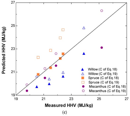 Figure 4 compares the predicted values of the carbon content, the hydrogen content, and heating value obtained from Equations (18)–(22) with the measured data reported in Refs. [48,49]. It is evident from Figure 4a that Equations (18) and (19) satisfactorily predict the C content. A maximum error of 7.23% is found for miscanthus when C is predicted by Equation (18). For woody biomass, a maximum error of 8.6% is found for spruce from Equation (19). In the case of H, as shown in Figure 4b, the largest difference between the predicted and measured values found for miscanthus is 12.33% when Equation (21) is used. Also, a reasonable accuracy of prediction is found for HHV in Figure 4c with a maximum error of 8.2%. Overall, the agreement between the predicted and measured values in Figure 4 is acceptable for engineering applications.