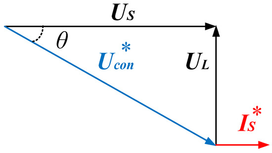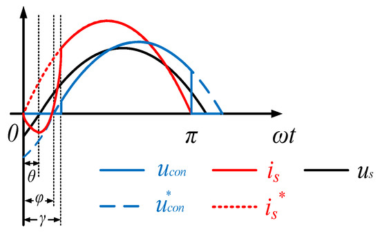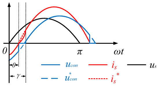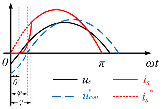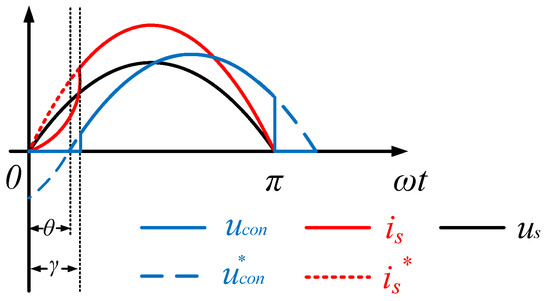 When the angle of the lagging power factor is θ under a complementary drive, there are two phase relations between the AC-side voltage and the input current according to the value of |uL| and |ussinθ|. In Figure 9, is goes ahead of ucon. Based on the above analysis, the piecewise function expression of is is: