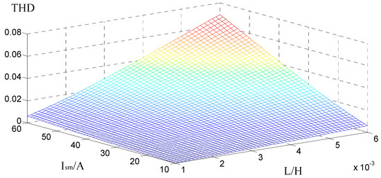 At first, the limitation of THD on L and Ism was investigated. Taking θ = 0° as an example, Figure 11 shows the relation between current THD and L and Ism when Usm = 311 V, f = 50 Hz, and Udc = 400 V. When L was chosen from 1–6 mH, and Ism was changed from 10 to 60 A, the degree of input current distortion was aggravated with the increase in L and Ism, and the maximum THD reached 6.96%. Figure 12 shows the contour line of THD with current and inductance when Usm = 311 V, f = 50 Hz, and Udc = 400 V. The values of L and Ism can be determined based on the allowable range. For example, the shaded area in Figure 12 is the limitation on L and Ism when THD < 1.4%. It is assumed that Ism = 40 A, so 2.5 mH inductance can be selected when the THD of the current requirements are satisfied. In this case, THD was about 1.25%. In practical applications, if the THD of the equipment current is above 5%, the equipment will not be allowed to connect to the grid. Hence, the contour line of current 5% THD should be drawn and the RPC and HCC functionalities of bridgeless rectifiers should be limited in practical applications.