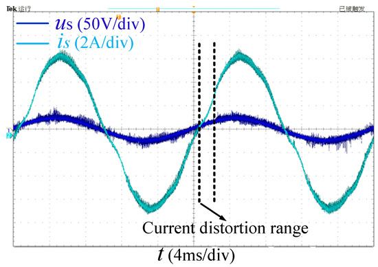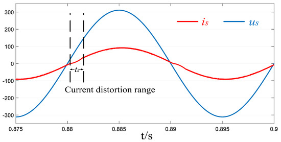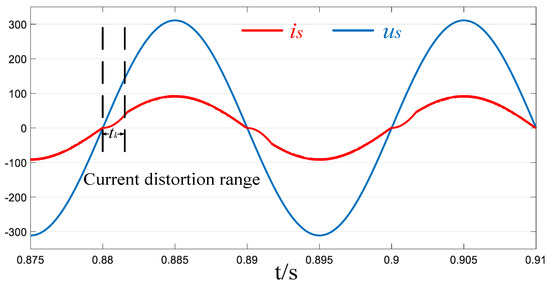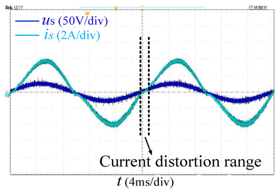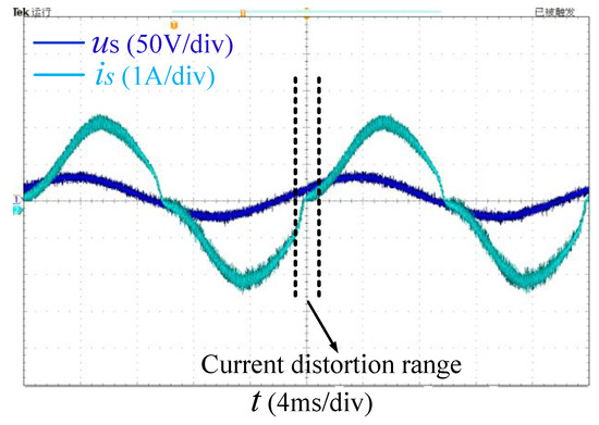 Figure 7 shows the AC-side fundamental waveform of a system with a synchronous drive. When ωt = 0, the polarity of is reversed from negative to positive, is zero, and the polarity of is negative, which leads to the negative increase in . The rate of increase of is larger than that of in the heavy load. In order to make follow , is clamped to zero until when ωt = γ. The amplitude of is smaller in the underloading. can be achieved within a certain period after reversing the polarity of is. When us approaches 0, the growth rate of decreases. The change rate of is is 0 when ωt = θ, . Then us reverses its polarity. To make follow , is clamped to zero until . The current distortion process will end at this point.