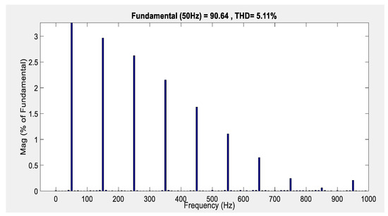 In order to reduce the current distortion, the complementary drive was adopted for the simulation. Figure 14 depicts the simulation waveforms of the grid voltage and input current under a unity power factor. Voltage and current are in phase, and the current is obviously distorted at the point. The distortion angle is 0.523 radians. The current THD shown in Figure 15 is 5.11%. The theoretical value of distortion angle is 0.5438 radians, and THD theoretical value was 5.01%. Therefore, the theoretical value is basically the same as the simulation result.