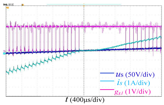 Figure 22 shows the waveform of us and is under a unity power factor. The zero-crossing points of is coincided with us, and is distorted based approximately on the cosine law in the period after crossing the zero point. Figure 23 shows the zoomed-in waveforms of driving signals gS1 and is of us and S1. us > 0 during the distortion period of is, whereas S1 remains in conduction in order to make ucon approximate zero. All the above experiment results satisfy the theoretical analysis.