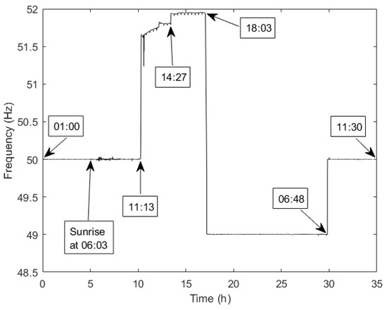 The frequency variations between 51 and 52 Hz are caused by the FSPC used by the Sunny Island inverters to curtail production from the solar PV installation when there is not enough consumption. The larger frequency variations from 52 to 55 Hz occur when there is not enough consumption during the daytime and when the FSPC increases the frequency towards 55 Hz to shut down the solar inverters in order to synchronize with the utility grid.