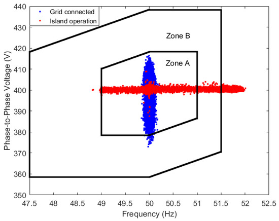 Figure 9 that the voltage varies more for the grid connection than islanded operation which also causes some grid connected values to end up in Zone B.