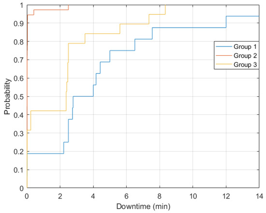 Grid to grid interruptions are not considered since the nanogrid internal energy system is not operational in those cases. The individual downtimes of the interruptions for each three groups are plotted in an empirical CDF in