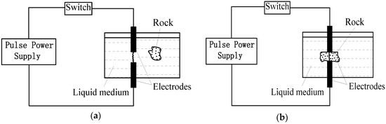 The exploration and drilling of oil, natural gas and geothermal wells are expanding continuously. Traditional mechanical drilling techniques have the disadvantages of low efficiency and high cost when used for deep and ultra-deep holes and hard rock such as granite. Therefore, research into high-efficiency technology for the drilling of rock is imperative [1,2]. At present, the main methods of non-mechanical rock breakage are by water jet, laser drilling, high-voltage electro pulse discharge, ultrasonic waves, and heat energy [3,4]. EPB [1], a type of high-voltage electro pulse discharge drilling, has high rock-breaking efficiency and produces good wall quality. Hence, it is a new and efficient potential rock breaking technique. High-voltage electric pulse discharge drilling methods can be divided into electrohydraulic rock breaking and electro pulse rock breaking, as shown in Figure 1. When discharge plasma is produced in a liquid medium, rock is mainly broken by the mechanical forces produced by the discharge, such as its shock wave, bubble collapse and pressure wave. This effect is called electrohydraulic rock breaking. With a high-pressure short pulse with a rising time of less than 500 ns [5,6], the breakdown field strength of the rock is less than that of the liquid medium used, such as low conductivity water or oil, as shown in Figure 2. At this time, the discharge plasma is mainly in the rock. Rock breakage occurs due to the stress caused by expansion of the plasma channel. This breaking method is called electro pulse rock breaking. Andres [7], Fujita et al. [8], and Ito et al. [9] have compared the electrohydraulic and electro pulse rock breaking methods. They found that the electrohydraulic technique breaks rock indirectly, while the electro pulse technique breaks it directly. Given the same amount of power, electro pulse rock breaking produces a better breaking effect. Furthermore, electric pulses propagate faster in rock than in water. Therefore, the crushing efficiency of electro pulse rock breaking is higher. Electrohydraulic rock breaking occurs mainly via compression failure, while the tensile stress that is formed in the process of electro pulse rock breaking makes the rock easier to break. Finally, the energy consumption of electro pulse rock breaking is lower than that of electrohydraulic rock breaking.