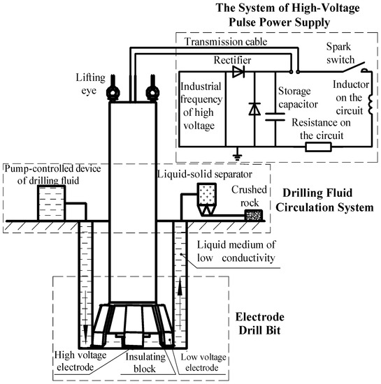 EPB systems include a high-voltage pulse power supply, a drilling fluid circulation system, and an electrode drill bit. The structure and composition of an EPB system and a drilling principle diagram are shown in Figure 3.