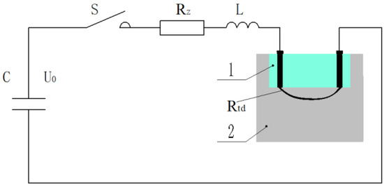 Equivalent circuit of high-voltage electro pulse breakdown: 1–water medium, 2-rock, C–storage capacitor, S–spark switches, Rz–circuit resistance, L–inductive inductance, Rtd–resistance of plasma channel.