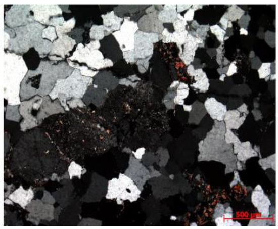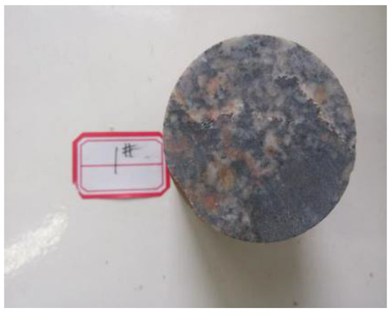 In the EPB simulation process, granite rock is simulated and analyzed. Granite samples were taken from high-abrasiveness strata in the Harizha mining area of the ore-forming band in Kunlun, China. When mechanical drilling is used in this mining area, strata with high abrasiveness are often encountered, which reduces drilling efficiency and shortens the drill bit lifespan markedly. One type of test samples and mineral slices of granite from the Harizha mining area are shown in Figure 5 and Figure 6.