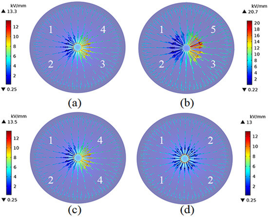 The results of the simulation of the influence of granite composition on EPB are shown in Figure 8. In the process of simulating the effect of granite composition on EPB, the electrical parameters, electrode spacing, and electrode shape remain constant. It can be seen from Figure 8a that different granite compositions affect the field strength. This conclusion is consistent with that of Wang et al. [20]. The electrical permittivity of plagioclase and biotite is larger than that of potassium feldspar and quartz. The field strength of plagioclase and biotite is larger than that of potassium feldspar and quartz. The maximum electric field strength of granite with this kind of composition is 13.3 kV/mm. It can be seen from Figure 8b that the model of granite with this kind of composition contains 25% magnetite with an electrical permittivity of 65. In the process of EPB, the maximum electric field strength of this kind of composition is 20.7 kV/mm. It can be seen from Figure 8c that the granite simulation model of this kind of composition contains 50% biotite. The electric field intensity of biotite is greater than that of potassium feldspar and quartz. The maximum electric field strength of the granite is greater than that shown in Figure 8a. It can be seen from Figure 8d that the electric field strength of the granite simulation model of this kind is the smallest, and the electric field strength of each component is uniformly distributed. This phenomenon is due to the similar electrical permittivities of potassium feldspar and quartz. It also can be concluded from Figure 8 that the electric field intensity is higher near the boundaries of the different components and the high-voltage electrode.