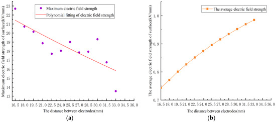 When the influence of electrode spacing on EPB is simulated, the granite composition, electrode shape and electrical parameters remain constant. The electric field intensity and distribution for 12 spacings of high- and low-voltage electrodes were simulated and analyzed. The high- and low-voltage electrode spacing ranged from 33 mm to 16.5 mm with a step size of −1.5 mm. Curves of the maximum electric field intensity on the granite surface are shown in Figure 9a according to changes in electrode spacing. It can be seen from Figure 9a that the maximum electric field intensity on the surface of the granite increases as the electrode spacing decreases. The granite is composed of potassium feldspar, plagioclase, quartz, and biotite. The maximum electric field intensity on the granite surface was 22.69 kV/mm at 16.5 mm. The influence of electrode spacing on the composition of granite was further determined on the basis of the study by Wielen et al. [22]. The curve of the average electric field intensity on the granite surface is shown in Figure 9b with various electrode spacings. It shows that the average electric field intensity on the granite surface decreases with decreases in electrode spacing.