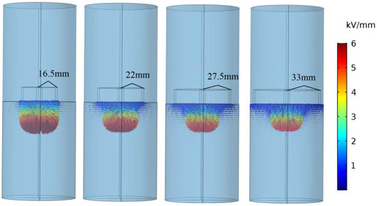 In the simulation of the electric field distribution in granite during EPB, several 2-mm-interval cross-sections were built within the granite model, starting at 2 mm from the surface. The results of the simulation of the influence of electrode spacing on the electric field distribution are shown in Figure 10 for the granite interior during EPB. It can be seen from the diagram that the maximum electric field intensity in the granite interior increases with decreases in electrode spacing. The distribution of the electric field is more concentrated and is deeper. This means that the granite breakage depth during primary discharge is deeper, but the range of electric field intensity is narrower. At the same time, the electric field distribution inside the granite shows that its intensity was greatest in the vicinity of the high-voltage electrode. The greater the radial distance from the high-voltage electrode, the smaller the intensity of the electric field.
