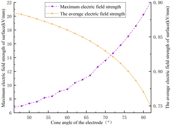 The influence on EPB of an electrode with a cone-horizontal surface angle of 46°, step length of 2°, and maximum taper of 82° was analyzed. The granite composition, electrode spacing and electrical parameters remained constant. Curves of the maximum and average electric field intensities on the granite surface with various electrode shapes are shown in Figure 11. It is shown that the maximum electric field intensity on the granite surface increases with increases of the angle. The granite was composed of potassium feldspar, plagioclase, quartz, and biotite. With an angle of 82°, the maximum electric field intensity on the granite surface is 22.09 kV/mm. However, the average electric field intensity of the surface decreases with increases of angle.
