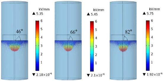 Kusaiynov et al. [11] designed an electrode drill with a zigzag shape that can increase the electric field strength without changing the input. The distribution of the electric field in granite during EPB is shown in Figure 12. It can be seen that the maximum electric field intensity in granite increases with increases of angle, but the extent of the increase is low. At the same time, the electrode shape has little effect on the internal electric field depth.