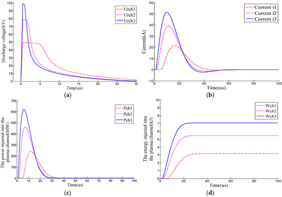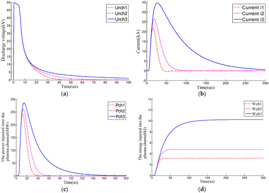 When the capacitor values of equivalent circuit are C1 = 8 uF, C2 = 16 uF, and C3 = 64 uF, the equivalent discharge voltage waveform, discharge current waveform, power waveform and energy waveform injected into the plasma channel are as shown in Figure 14. It can be seen that the capacitance value has a great influence on the output voltage and current waveform. The pulse width of the discharge voltage and current increases with increases in capacitance. The power and energy injected into the plasma channel increase simultaneously in a single discharge. However, as the capacitance value increases, the charge and discharge time increase, and the discharge rate decreases.