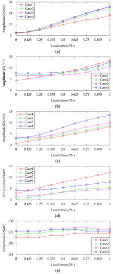The radial electromagnetic force in the air gap will affect the radial electromagnetic force on the stator teeth directly. The mode number of the radial electromagnetic force l is equal to 0, 2, 4, 6, 8... only, according to Table 3, Table 4 and Table 5. When l is equal to 0, the excitation frequency is far away from the resonance frequency, so it will not cause big vibration noise, and for the 2nd, 4th, 6th, 8th, 10th, 12th and 14th order, its amplitude curve of the radial electromagnetic force in the air gap with the load times can be obtained by the 2D finite element, as shown in Figure 3 (2D diagrams) and 4 (3D diagrams). The four different colors in the diagram correspond to Cases 1–4.