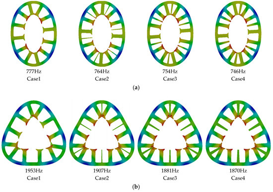 Compared with the resonant frequencies of the different small teeth width in Figure 7, it was found that the resonant frequencies of the same mode order decreased weakly in Cases 1–4, and the small teeth had a weak effect on the resonant frequencies in the same mode shapes.