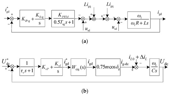 GSC current is determined by its reference value, which is related to DC bus voltage in the outer voltage loop. According to Figure 1 and Equation (6), the d-axis component of GSC current is:
