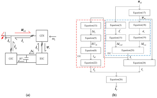 To demonstrate the transient short-circuit current calculation model of DFIG-WT effectively, a simplified diagram of the relations among key electrical quantities based on the structure of DFIG-WT is shown in Figure 3a, and a detailed flow chart of the entire derivation process is presented in Figure 3b. In the figure, the symbol in bold represents complex vectors in the two phase synchronous rotation coordinate system, and the normal form represents the d (or q)-axis component.