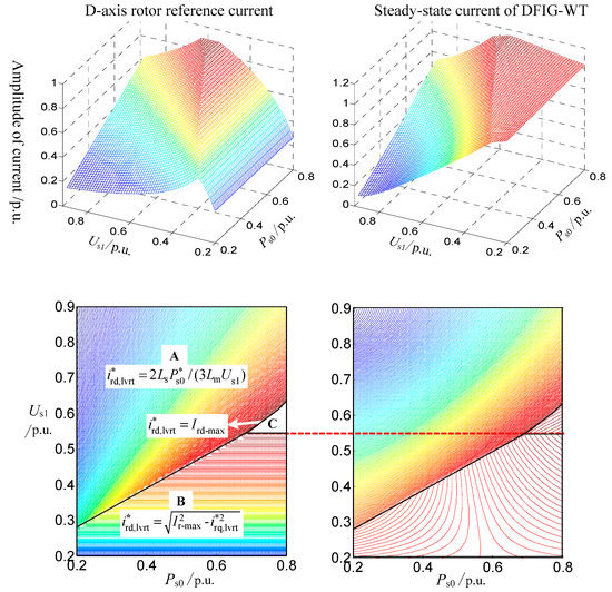 With a detailed short-circuit current calculation model, quantitative analysis can be carried out to further reveal the fault characteristics of DFIG-WT. Among all the frequency components of the SCC, fundamental components are the most important to protection settings. As shown in Equations (22) and (24), fundamental components of total SCC are mainly composed of steady-state components, while the transient fundamental components attenuate rapidly. Therefore, a detailed analysis of the steady-state current of DFIG-WT was carried out considering the current limit.