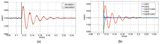 - Udc6 and Udc7 in DC bus voltage are related to the characteristic roots of the transfer function of the DC voltage loop. According to Equation (10), the characteristic roots are related to the intermediate frequency bandwidth of the DC voltage loop. When ωcv < 7, the characteristic roots of the transfer function are a pair of conjugate complexes. Under this circumstance, Udc6 and Udc7 are oscillating attenuation components. The oscillation period is the imaginary part of the characteristic roots, and the attenuation time constant is the reciprocal of the real part of the characteristic roots. When ωcv ≥ 7, the characteristic roots are two different (or same) real numbers. In this case, Udc6 and Udc7 are DC attenuation amplitudes, and the attenuation time constant is the reciprocal of the characteristic roots.