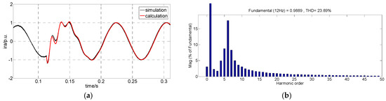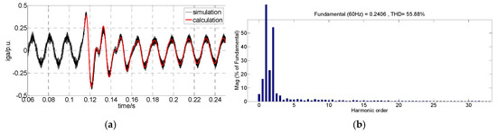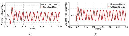 Parameters of the tested DFIG-WT are substituted into Equations (21), (24), and (26) to obtain the calculated waveforms of the DFIG-SCC under different conditions. A comparison between the actual waveforms and calculated waveforms is shown in Figure 14. Transient characteristics and the attenuation law of the calculated waveform and simulated waveform are consistent. However, the first three circles do not match well. This is because the controller may not be able to perform as ideally as the simulated model under severe fault conditions. Moreover, the steady-state short-circuit current agrees precisely.