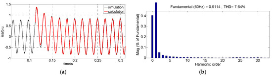 Comparing Equations (21) and (22), GSC current in the synchronous reference frame contains frequency components corresponding to the transient attenuation components in Udc and additionally generates a DC attenuation component with time constant τv due to the inner current loop. According to Table 1, Udc2 has a small amplitude, and Udc3, Udc4, and Udc5 attenuate quickly. Therefore, it is applicable to neglect the above parameters to obtain a simplified expression of GSC current. Transferred into the stationary reference frame, the a-phase expression of GSC current is:
