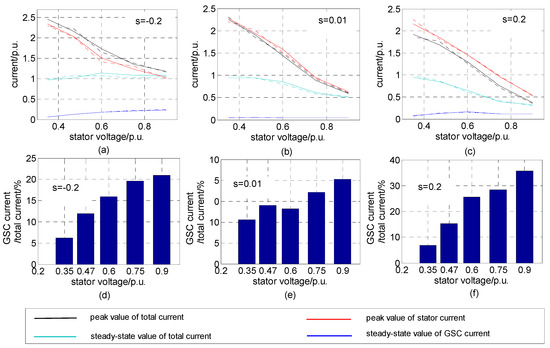 The diagrams in the first row of Figure 11 show variations of the four key characteristic parameters with different residual voltages and operating conditions. Under the supersynchronous condition, the peak value of total current is higher than that of stator current. However, the opposite phenomenon is observed under the subsynchronous condition, while under the synchronous condition, these two parameters are almost equal to each other. This is because GSC current has the same direction as stator current under the supersynchronous condition, the opposite direction under the subsynchronous condition, and almost 0 under the synchronous condition.