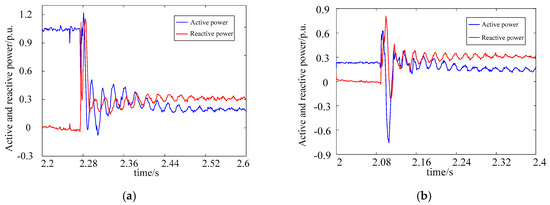 Active and reactive power generated by wind turbines under two test conditions are shown in Figure 13. As the grid codes require, wind power generators should output reactive power during the LVRT process to support grid voltage recovery. It can be concluded from Equation (3) that active power during the LVRT process under different operating conditions should be the same with the same voltage dip level. As shown in Figure 13, the reactive power is about 0.3 p.u. under both test conditions during the LVRT process as the residual voltages are the same. Reactive power output is the primary concern for DFIG-WT control, limiting the active power output capacity. The active power in the supersynchronous condition (about 0.21 p.u.) is slightly larger than that in the subsynchronous condition (about 0.14 p.u.). This is because GSC outputs active power under the supersynchronous condition and absorbs active power under the subsynchronous condition.