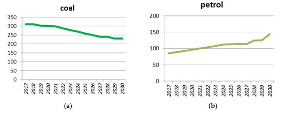 According to China Energy consumption Statistics Yearbook, this article used the amount of energy consumption in the Beijing-Tianjin-Hebei region from 2005 to 2016 as the input data of GM (1, 1). Then, we forecasted the consumption of four types of energy sources from 2017 to 2030. The forecasting results are shown in Figure 3.