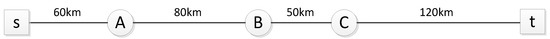 C are candidate nodes. If the endurance range of BEV is 150 km, there are two station sets {