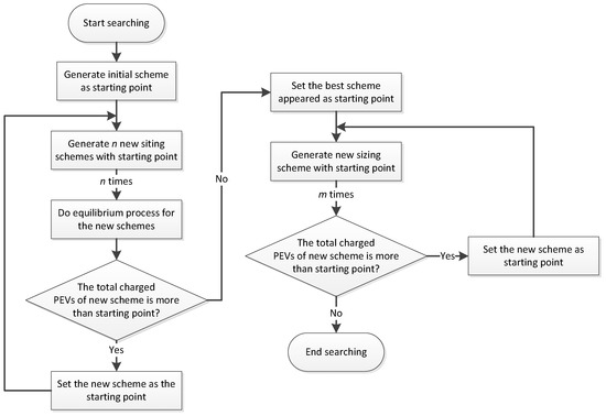 If a siting and sizing scheme has already consumed the budget completely, there are two ways that may increase the total charged flow. One is to decrease the number of stations, which brings more investment to construct charging piles that can directly increase the charging capacity of a station. The other is to raise the proportion of the short-term demand in the total demand, which takes less service capacity. Thus, we first find an initial solution that can consume the entire budget as the start point of the search, and then change the number and location of the charging station existing in the scheme to achieve less station with more short demand. Finally, we try to find the best sizing scheme of the given siting scheme. The approach can be illustrated with the following steps: