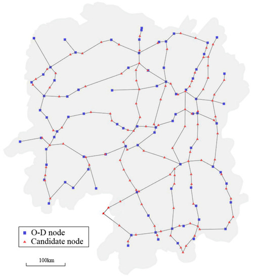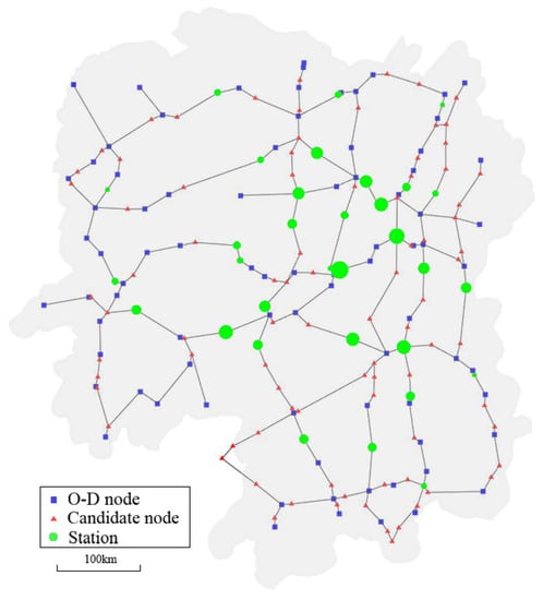The highway network is defined as a network G(N, L), where N consists of the O–D nodes and the candidate locations for a charging station, and L denotes the roads between these nodes. The O–D nodes denote the cities and towns in the network while the candidate locations are the existing service areas. Constructing charging stations in the service areas can save budget as there has already been some basic infrastructure. As the charging pile stations are often built in pairs along the road, we combine the twin stations in the same node as one, which can serve the demand from both directions. The service capacity of each station depends on the number of charging piles in it.