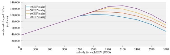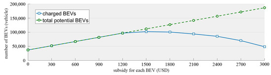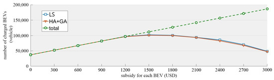 Figure 5 shows the optimizing results of LS under different subsidies. The results are the mean value of running this 20 times. When the subsidy for each BEV reaches 1500, the constructed infrastructure cannot fulfill all the potential demand. When the scale of the subsidy continues growing, there is even less budget for constructing infrastructure. Thus, the maximum amount of charged BEVs must appear in the situation that the constructed facilities can just fulfill the entire potential demand. However, the subsidy offered by the government cannot be accurate to detail this number, which is always a whole hundred number, and we only need to compare the results around the separating point like 1200 in