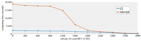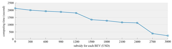 Figure 6 shows the computing times of the LS under different subsidies. The computing times are the mean value of 20 times running. The computing time stays in a high level when the subsidy is under 1200, because all the potential demand needs to be considered as the construction fee is sufficient. Then, the computing time begins to decrease when the subsidy is between 1200 to 2400. In this region, the potential demand cannot be fulfilled, but the convergence of LS is slow as there are many available siting and sizing schemes. When the subsidy reaches 2700, the computing decreases swiftly as the construction fee can only afford to build a few charging stations, which leads to the rapid convergence of the search. In general, the LS can obtain the solution with acceptable time cost.