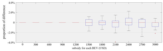 Figure 6, when the subsidy is below 1500, the LS can always find the solution that meets all the potential demand. When the subsidy reaches 1500, the maximum difference does not exceed 4.0%, which proves a reliable stability of the LS.