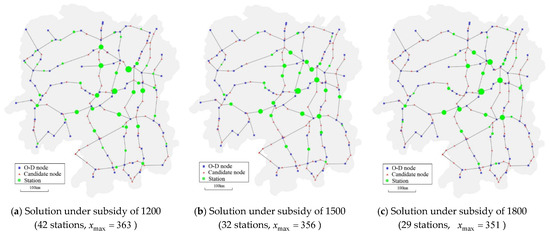 Figure 9a–c presents the deployment of the charging station with the subsidy from 1200 to 1800 for each BEV. When the subsidy is low, the charging stations spread all around the network to catch as much demand as possible. The proportion of the construction fee decreases when the subsidy rises, which leads to the reduction of the station quantity. As the potential BEV flow grows with the subsidy, the stations become more concentrated in the high distribution area of charging demand. Thus, a high subsidy may reduce the scope of the station deployment, which is not advantageous for promoting the adoption of BEV.