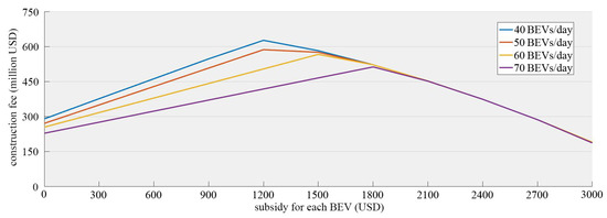 Figure 11, when the subsidy is below 1500, the budget is sufficient to charge all the potential demand. The number of charged BEVs does not increase with improvement of the capacity. However, the construction fee decreases as the facilities have larger capacity that can charge more BEVs. When the subsidy is beyond 1500, the left budget cannot afford to charge all the potential demand. Thus, the left budget must be fully used to meet as much demand as possible. As the construction fee is fixed, the facilities with larger capacity can meet more potential demand. To illustrate the impact of the capacity on the subsidy, the best arrangements of the budget are listed in
