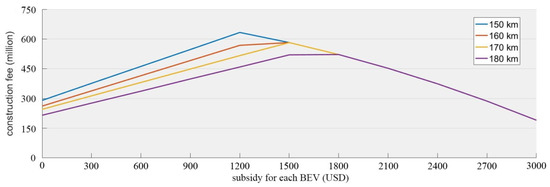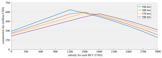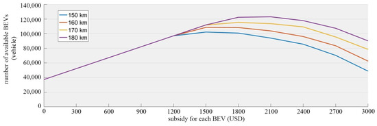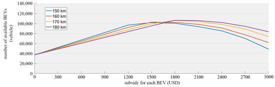 When the endurance range rises, some BEVs do not need to recharge during the trip. Then we need to discuss whether this part of the demand should be subsidized. If we do not subsidize the recharge-free BEVs, the potential demand of this part will not increase with the subsidy. The optimization results under different subsidies would be like those in