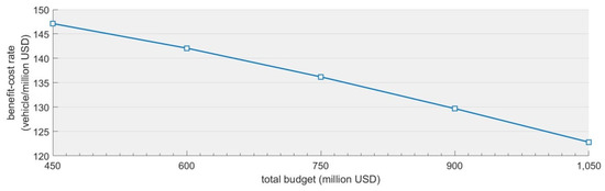 Another issue is the benefit–cost rate of the budget. We take the best solutions under the budget of 450, 600, 750, 900 and 1050 million dollars to draw the curve of the benefit-cost rate, which is shown in