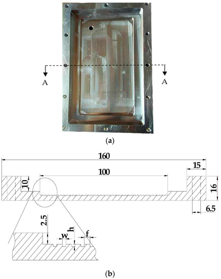(a) A photo of a fabricated flat micro-grooved gravity heat pipe (FMGHP); (b) The A–A cross-section of the micro-grooves in a FMGHP (units: mm).