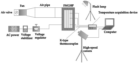 The experimental system includes the semi-visualization FMGHP, a heating system, a cooling system and a data acquisition system. The semi-visualization FMGHP was experimented with in a vertical orientation. In the heating system, the heat for the evaporation section was provided by a heat block (100 mm × 90 mm × 10 mm), which was tightened to the external surface of the evaporation section (with a width of 100 mm and a height of 90 mm). In the cooling system, the condensation section (with a width of 100 mm and a height of 90 mm) of the FMGHP was cooled by forced air at a constant temperature and flow rate. There is a transition/adiabatic section between the evaporation and condensation sections, which has a width of 100 mm and a height of 30 mm. In the data acquisition system, three K-type thermocouples were arranged at selected positions on the Z-axis to monitor the temperature variation at the evaporation, transition and condensation sections. The visualization was performed using a high-speed camera (model i-SPEED3). In addition, the heating and cooling system were wrapped in insulation cotton to minimize heat loss during the experiment. The experimental system is shown in Figure 2.