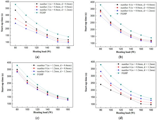 Figure 3d compares the three FMGHPs with a FGHP. It is shown that the FMGHPs have the same depth of 1.2 mm and different widths. The start-up time of the FMGHPs decreases with a decreasing width of the micro-grooves at each heating load. For instance, when the heating load is 120 W and the width is 0.4 mm, 0.8 mm and 1.2 mm, the shortest start-up times are 170 s, 180 s and 204 s, respectively. They decline by 29%, 25% and 15% compared with the FGHP without micro-grooves. FMGHP 3, with narrower and deeper grooves, has the shortest start-up time at each heating load. The bigger capillary force due to the narrower micro-grooves primarily affects this performance [1,5]. When the heat pipe has narrower micro-grooves, the condensed working fluid draws back to the evaporation section in less time with the effect of bigger capillary force and gravity. Thus, the response time of the FMGHP is further shortened.