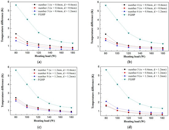 By comparing FMGHP 3, FMGHP 6 and FMGHP 9 with FGHP in Figure 4d, it is shown that the temperature difference of the three FMGHPs decreases with the decreasing width of the micro-grooves at each heating load. For instance, when the heating load is 120 W, the temperature differences are 0.848 K, 0.901 K and 1.100 K respectively, which are declined by 66%, 64% and 56%, compared with that of the FGHP without micro-grooves. The lowest temperature difference is obtained by FMGHP 3. In this case, the micro-groove width is reduced, and the fin thickness is increased without changing the depth and quantity of the micro-grooves. This leads to a higher capillary pumping force and better thermal performance. In fact, the narrower width brings negative effects. The reduction in width causes a reduction of the cross-sectional area in the micro-grooves, which results in higher flow resistance [14]. However, the driving force from the pressure difference plays the primary role on the thermal performance while the heat transfer area and the liquid–vapor phase change area play the secondary role [13]. Therefore, in this case, these counteracting influences ultimately contribute to an increase in the temperature difference and thermal performance of the FMGHPs.