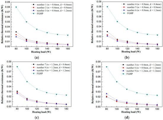 The relative thermal resistance of the FMGHPs and FGHP at different heating loads: (a) FMGHPs 1–3 and FGHP; (b) FMGHPs 4–6 and FGHP; (c) FMGHPs 7–9 and FGHP; (d) FMGHPs 3, 6, 9 and FGHP.