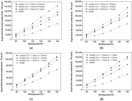 The equivalent thermal conductivity is a general indicator for heat transfer performance of a heat pipe. The equivalent thermal conductivity of the FGHP and FMGHPs with different micro-groove depths (0.4 mm, 0.8 mm and 1.2 mm) increases as the heating load increases, shown in Figure 6a (w = 0.4 mm), Figure 6b (w = 0.8 mm) and Figure 6c (w = 1.2 mm), respectively. When the heating load remains constant, the equivalent thermal conductivity of the FMGHPs increases with the increasing depth of the micro-grooves. FMGHPs 3, 6 and 9 have the highest equivalent thermal conductivity shown in Figure 6a–c, respectively. The FGHP without micro-grooves has the lowest equivalent thermal conductivity.