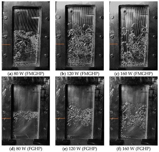 When the heating load is 80 W in the FGHP at 300 s, a small amount of bubbles can be observed in Figure 7d. The relatively calm working fluid at the bottom zone of the evaporation section in the FGHP also proves the relatively weak liquid–vapor two-phase behavior. In comparison, the liquid–vapor two-phase behavior in FMGHP 3 shown in Figure 7a is relatively intensive. Larger and more bubbles can be seen in FMGHP 3 compared with the FGHP. Similarly, the coincident observations also exist in Figure 7b,e (120 W) and Figure 7c,f (160 W).