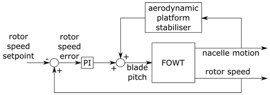 The conventional PI control loop is based on the blade-pitch angle modification for wind turbine rotor speed regulation. This regulation is essential to keep the rotor speed as close as possible to the rated value, in the above rated wind speed region, to produce a good electric power quality with small oscillations. The conventional PI control is tuned to be as vigorous as possible to avoid the large responses to wind gusts. Although this is the wind turbine PI tuning goal, in FOWTs, the conventional PI controller bandwidth cannot be higher than the natural frequency of the platform-pitch motion, as shown in [5]. The reason of this limitation is to avoid the negative platform damping effect in FOWTs.